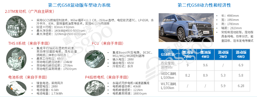 可持续迭代的GMC混动系统 据广汽传祺方面介绍,广汽正向自研的GMC双电机串并联混动系统作为广汽传祺发力混动市场的路线之一,目前已更新至2.0版本。该混动系统由发动机、电机和高功率电池集合而成,其中2.0L ATK发动机最高热效率为42.1%,GMC机电耦合系统拥有集成式双电机多挡DHT,可实现多挡模式驱动和大扭矩输出,WLTC工况下热效利用率超过95.5%。 广汽GMC混动系统,图片来源:广汽传祺 对于广汽自主研发的GMC混动系统,盖世汽车研究院分析师评价说,GMC混动系统为双电机P13 DHT架构,采用2挡变速机构,与市面上的比亚迪DM-i、长城柠檬DHT、吉利雷神混动、东风马赫动力以及奇瑞的DHT属于同一技术流派,因此搭载该系统车型的性能表现与其他DHT混动车型基本不会有太大差异。也就是说这套混动系统在发动机性能和节油性方面与其它自主品牌推出的混动系统相比,没有明显短板。另据广汽传祺官方介绍, GMC混动系统还有一大优势就是技术扩展性强,可涵盖油电混动、插电混动、增程式混动,甚至氢动力系统。 传祺影酷是首款搭载钜浪混动 GMC2.0 的车型 , 广汽传祺旗下首款搭载钜浪混动GMC2.0的车型就是传祺影酷,这款车型于近期首发亮相,未来上市后将提供燃油版和混动版两种动力车型。同时,作为广汽传祺继影豹之后的第二款“影系列”产品,影酷也将承担起现阶段在SUV领域走量的重任。 另据了解,广汽GMC混动系统还在不断迭代,明年将推出1.5DHE+GMC3.0的混动系统,其中,1.5DHE集成GCCS、TGDI、LP-EGR和TMM等技术,热效率将达到43%,同时GMC3.0将采用P13架构,传递效率可达96.5%。从发动机热效率和GMC3.0的传递效率来看,其综合性能比2.0L ATK+GMC2.0更优。 借力“丰田THS”,动力上有突破 广汽传祺的第二条混动路线是广汽2.0TM发动机与丰田THS混动技术相结合的混动系统,目前,这套混动系统已搭载于传祺全新第二代GS8双擎系列车型上上市。其中,2.0TM发动机集成了GCCS燃烧控制系统、米勒循环、TGDI等技术,热效率为40.23%。 全新第二代GS8动力系统分析, 盖世汽车研究院分析师指出,广汽引进丰田的THS混动技术匹配自身2.0TM发动机的技术路线,利用了涡轮增压大动力系统,因此搭载该系统的车型在动力上较丰田相关搭载THS的车型有明显提升。如第二代GS8双擎版四驱车型零百加速做到了6.9秒,NEDC工况下的油耗为5.8L/100km。作为一款中型SUV,第二代GS8的动力和油耗在同级产品中具有一定优势。 传祺第二代GS8,图片来源:广汽传祺 在推出“钜浪混动”技术之前,广汽传祺的混动路线以PHEV为主。早在2015年,广汽传祺就推出了旗下首款插电混动车型GA5 PHEV,两年后又加码了GS4 PHEV和GA3S PHEV。不过,由于技术不够成熟,这些PHEV车型市场表现平平,除了GS4 PHEV还有一定声量外,其它两款车型由于销量惨淡均被迫停产。 今年,随着“钜浪混动”的到来,广汽传祺在混动领域的技术和产品与之前相比均有显著提升,这也促使其混动产品在终端市场上终于有了起色。据广汽传祺内部人士透露,4月搭载广汽2.0TM发动机与丰田THS混动技术的全新第二代GS8混动车型订单量占比达到了60%。 自主车企加速涌入混动赛道,或受市场红利驱使 目前,自主车企扎堆搞混动,在技术路线差距不大的情况下,主要目的之一就是降低油耗,以应对日趋严苛的排放法规,同时对国家提出的“双碳”目标做出响应。尤其是后者,随着我国明确提出实现“双碳”目标的时间节点,越来越多的车企加入减碳行列中来,其中,广汽集团提出将于2050年前(挑战2045年)实现产品全生命周期的碳中和目标。为实现这一目标,广汽将采用全生命周期管理、零碳工厂,以及“混动化+智能化”和“智能化+电动化”双路线的发展策略。广汽传祺作为广汽集团重点打造的核心乘用车品牌,提出在2025年实现全系车型混动化,2030年实现混动销量占比60%。 为实现“2025年实现全系车型混动化”这一发展目标,2022年,被广汽传祺视为混动元年。其实,对大部分自主品牌来说,今年同样是其全力扩充混动赛道的关键一年。 据了解,目前除了比亚迪用不断壮大的DM-i家族来进一步扩大其在混动市场的占有率外,吉利、长城、奇瑞、长安等在混动领域的布局也在提速。其中,吉利仰仗雷神智擎Hi·X混动平台,计划未来三年将旗下搭载雷神智擎混动系统的车型扩充至20余款;长城在混动领域推出了柠檬混动DHT系统,目前已经发布了包括WEY拿铁、WEY玛奇朵、哈弗赤兔等在内的多款搭载该混动系统的车型,接下来长城计划将柠檬平台和坦克平台的全系车型均混动化。此外,奇瑞在混动领域带来了鲲鹏DHT和星核动力ET-i,长安则拿出了“蓝鲸iDD混动系统”。 分析人士指出,自主品牌集体发力混动领域,除了与节能减排的大趋势有关外,还离不开这一市场广阔的发展前景。中国汽车工程学会在2020年10月发布的《节能与新能源汽车技术路线图2.0》中明确提出,未来10-15年内新能源汽车逐渐成为主流产品,到2035年混动新车占传统能源乘用车的比例将达到100%。这一广阔的发展前景无疑将为混动汽车带来巨大的市场红利,据盖世汽车研究院预测,未来几年混动汽车的市场份额将不断增长,预计到2027年国内混合动力乘用车规模将达到800万辆以上,在乘用车市场中的占比也将达到31.6%。 事实上,最近两年,在节能减排趋势助推下,混合动力汽车正迎来快速增长。从盖世汽车研究院统计的最近一年混动汽车单月销量情况来