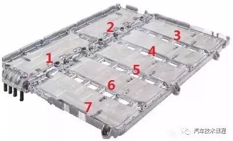 底部压铸铝箱体细节图,内部有7个液冷单元,可以粗略看到压铸冷板内预埋的金属换热管,其中液冷板既起结构支撑又起冷却换热作用,此类型集成冷板制造效率较高,另外也能解决一些冷却液泄露的问题。