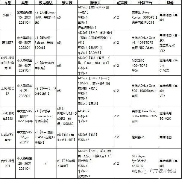 对国内主流高阶自动驾驶车型传感器方案进行了梳理如下图: