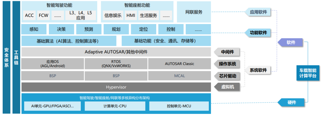 车载智能计算平台的功能实现需要丰富的硬件资源和复杂的软件支持。不同硬件资源的集成形成计算平台的硬件架构,将复杂的软件分层化处 理构成了计算平台的软件架构。计算平台硬件架构中的主控芯片集成了多个和多类计算单元,如CPU、GPU等,通常还包含了音频、多媒体、 显示、安全、通信、AI计算等子单元,不同种类的计算单元有各自的优势,分别负责不同任务。